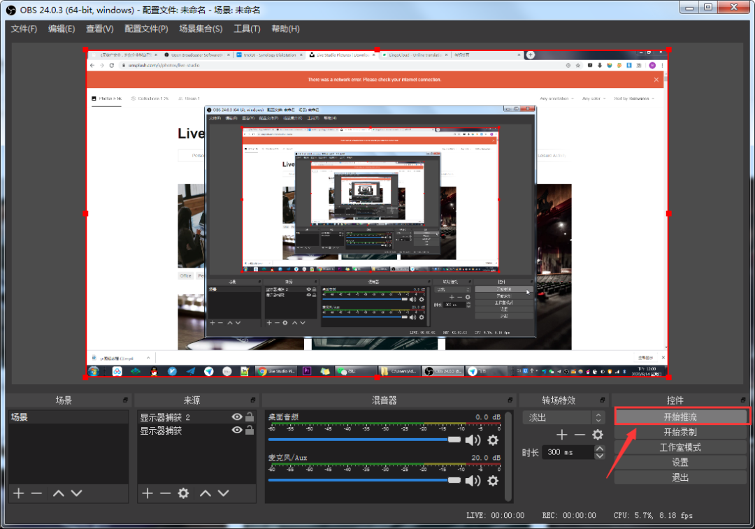 4.设置都没问题,点击开始推流后卡住。可能是是直播电脑配置不支持或者网络情况较差。请①调整网络状况;②在OBS的设置里面的输出中降低视频比特率。