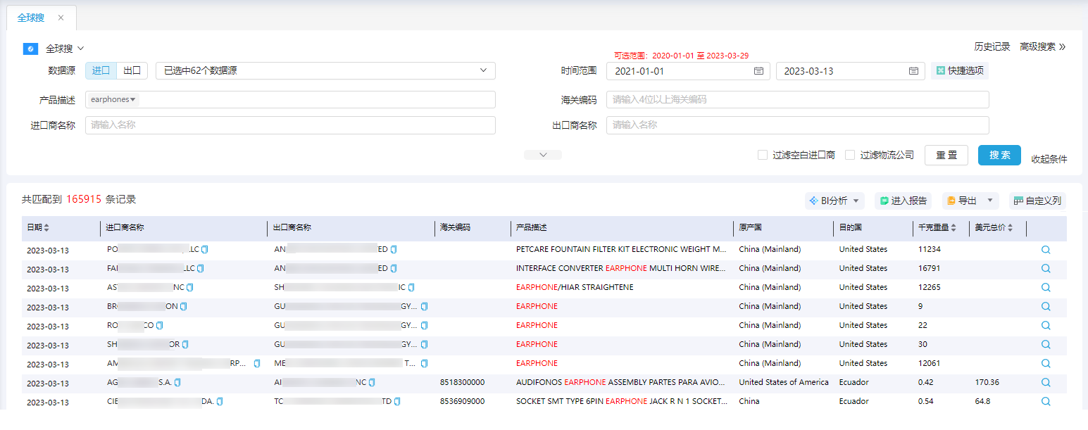 3. 结合该核心产品的特点从BG大游集团外贸通中,找出采购earphones的买家及其交易记录,顺利获得分析采购动态、交易趋势、供应链,竞品特点等等,有针对性的去挖优质潜客 。
