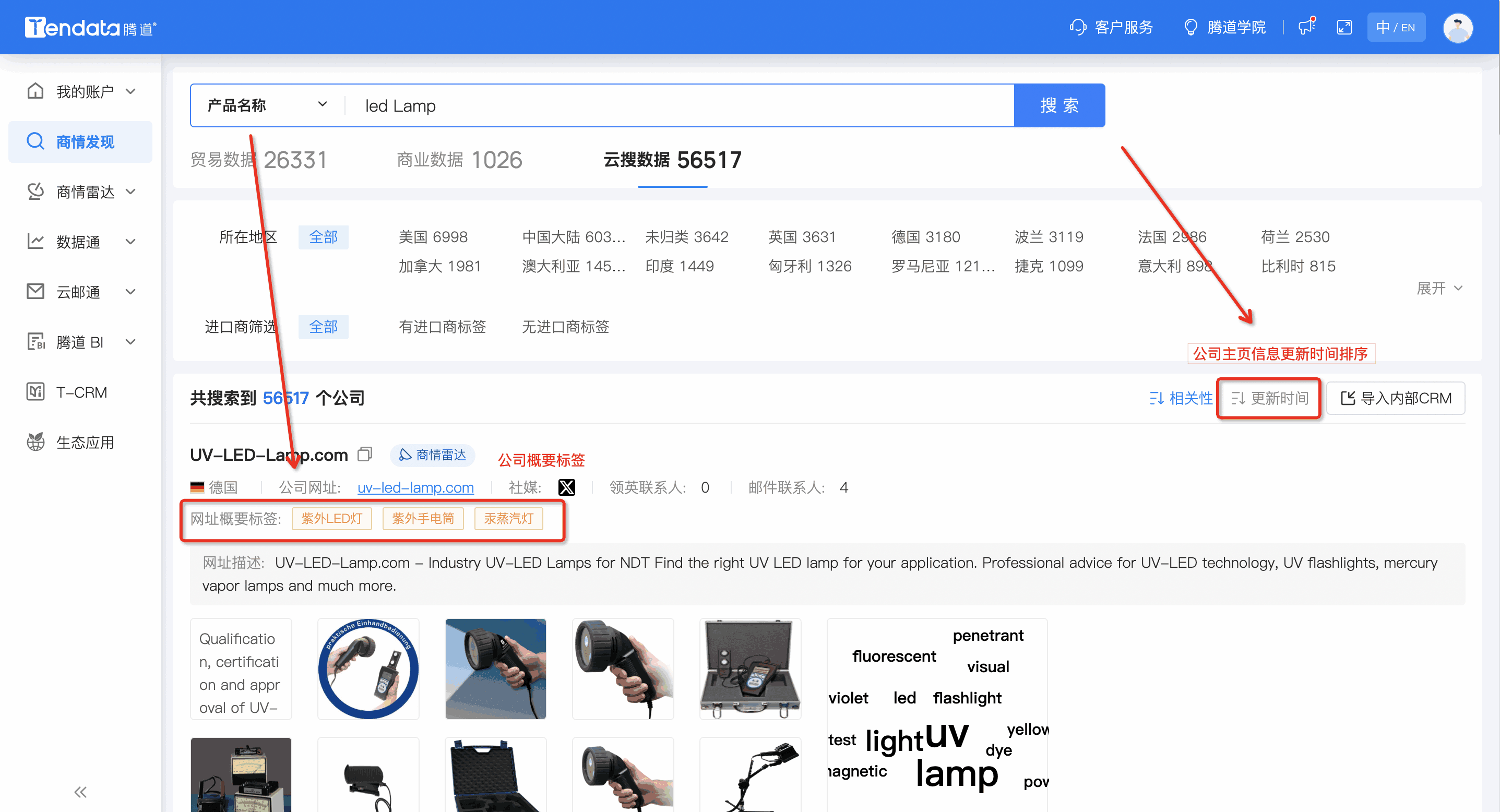 · 云搜数据(互联网数据):从全球互联网中查找所有外贸企业名录,查询全球企业产品,精准锁定公司信息,覆盖更多联系方式(关键人和职务、电话、 官网、 邮箱、地址等) ,链接全球主流社交媒体平台(领英、Facebook、推特等)。